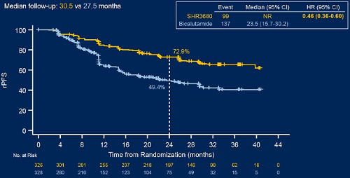 CHART研究是一项多中心、随机、对照III期临床试验。这项研究旨在探索瑞维鲁胺联合ADT对比标准治疗联合ADT在高瘤负荷mHSPC患者中的疗效和安全性。研究结果表明,瑞维鲁胺联合ADT可显著延长高瘤负荷mHSPC患者的总生存期(OS),并显著降低患者疾病进展或死亡风险。研究共入组654例患者,国内患者占比90.4%,高度贴合中国患者诊疗现状。基于独立评审委员会(IRC)的评估,相较于对照组,瑞维鲁胺降低患者42%的死亡风险及54%的影像学进展风险。瑞维鲁胺用药患者2年生存率为81.6%(对照组为70.3%,图1),2年无影像学进展率为72.9%(对照组为49.4%,图2),相较于对照组,2年生存率和无影像学进展率显著提高[1]。