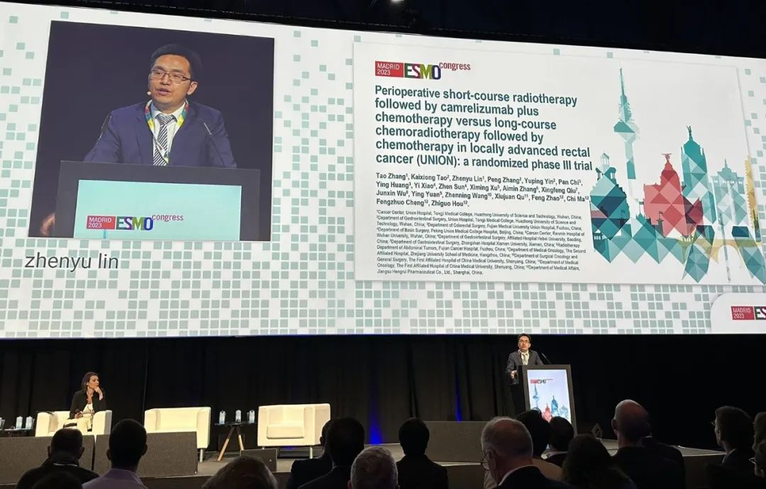 10月21日,利来医药创新药卡瑞利珠单抗的一项研究“新辅助短程放疗序贯卡瑞利珠单抗联合化疗对比长程放化疗序贯化疗治疗局部晚期直肠癌”随机对照Ⅲ期试验(UNION)亮相2023 ESMO大会优选口头报告现场。该研究由华中科技大学同济医学院附属协和医院张涛教授、陶凯雄教授担任主要研究者,华中科技大学同济医学院附属协和医院林振宇教授在大会现场报告了该重磅研究的结果1。此项研究是全球首个评估短程放疗序贯免疫治疗联合化疗治疗局部晚期直肠癌的Ⅲ期研究,已达到主要终点病理完全缓解(pCR),有望为直肠癌患者的治疗提供新策略。