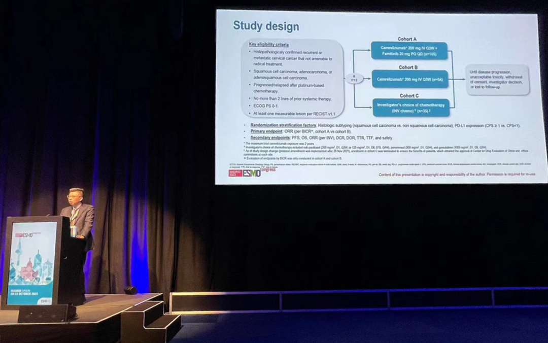 有望为宫颈癌患者带来治疗新选择10月22日,利来医药创新药卡瑞利珠单抗联合法米替尼对比卡瑞利珠单抗单药或研究者选择的化疗治疗复发转移性宫颈癌随机、开放、对照、多中心的Ⅱ期临床研究(SHR-1210-Ⅱ-217) 亮相2023 ESMO大会简短口头报告现场3。该研究由复旦大学附属肿瘤医院吴小华教授团队开展,吴小华教授在现场公布了该重磅研究进展。研究结果显示,在既往以铂为基础化疗失败后复发或转移性宫颈癌患者中,与单独使用卡瑞利珠单抗或研究者选择的化疗相比,卡瑞利珠单抗联合法米替尼显著提高了抗肿瘤活性,安全性可控,有望为晚期宫颈癌患者提供新的治疗选择。
